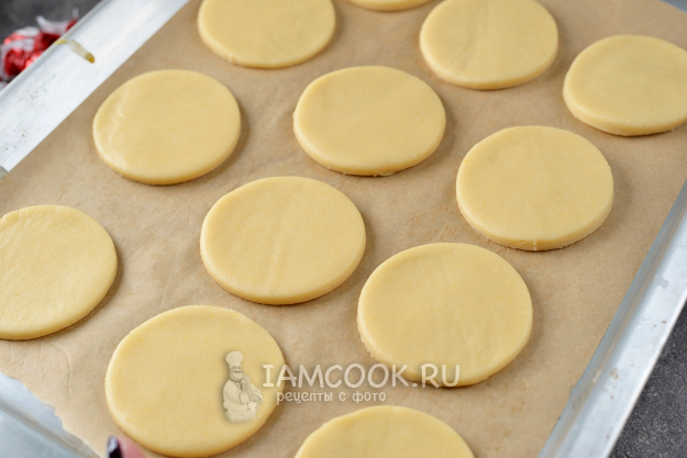 Круглой вырубкой для печенья сделайте заготовки, переложите их на противень, выстеленный бумагой для выпечки. Отправьте в предварительно разогретую до 190 градусов духовку минут на 10-13 без конвекции.