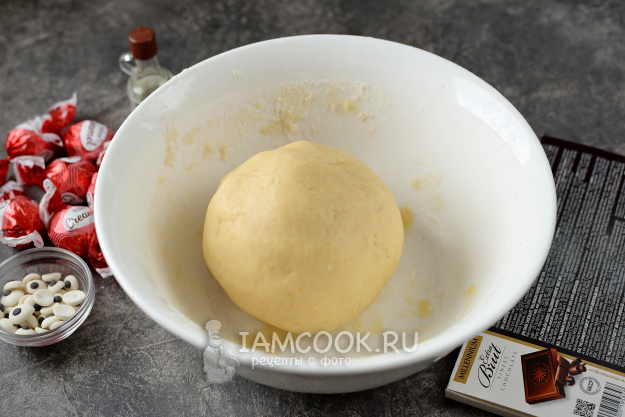 Потом соберите тесто в мягкий и эластичный шар. Если тесто будет клеиться к рукам и посуде, тогда подсыпьте еще немного муки. Накройте емкость пищевой пленкой и отправьте в холодильник минут на 20-30.