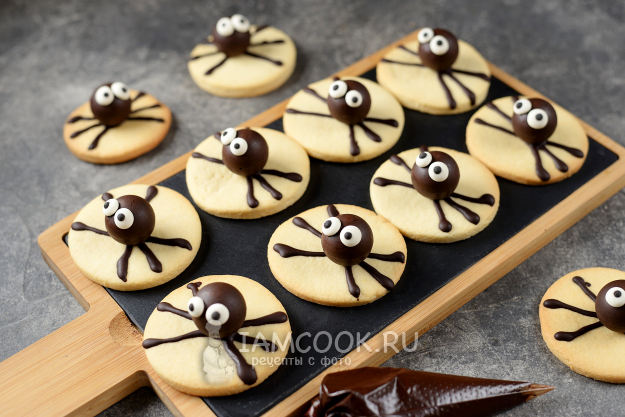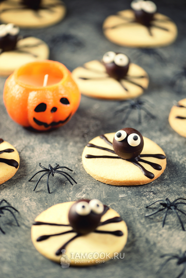 Песочное печенье «Паучки» на Хэллоуин можно подавать к столу с апельсиновым соком, например. Приятного.