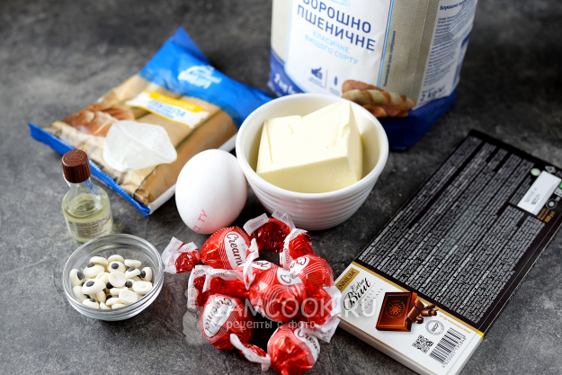 Подготовьте продукты для песочного печенья «Паучки» на Хэллоуин. Масло должно быть холодным. Шоколад можно взять как черный, так и молочный - какой больше любите.