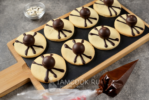 Готовое печенье выложите на удобную поверхность и остудите полностью. Поломайте небольшую плитку шоколада, положите в кондитерский мешок и отправьте в микроволновку на 40-50 секунд, он должен полностью растопиться. Затем срежьте уголок на мешке и нанесите на печенье "ножки" паучков, в середину положите круглую шоколадную конфету, поставьте в холодильник на минуту-другую, чтобы шоколад застыл.