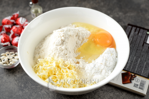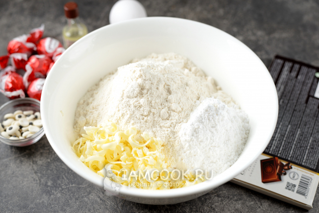 Натрите холодное масло на крупной терке, добавьте сахарную пудру и муку. Начните с 280 граммов, поскольку если яйцо не отборное, то этого количества будет достаточно, лучше потом подсыпать.