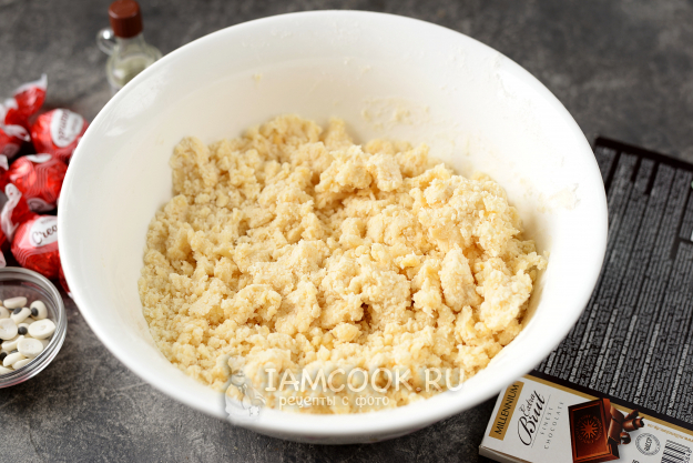 Начните растирать тесто руками, сначала у вас получится крошка.