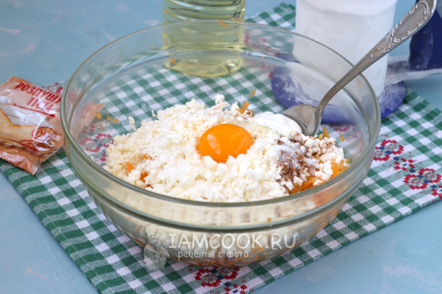 Добавить к тыкве творог, сахар, яйцо, сметану и корицу. Немного перемешать массу ложкой.
