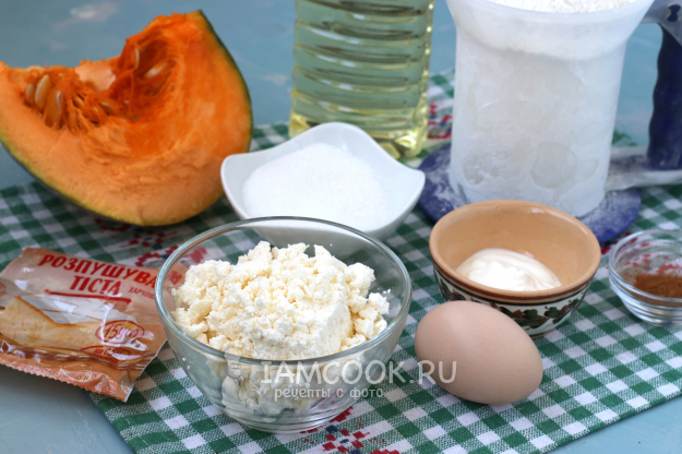 Для приготовления тыквенных оладий с творогом подготовить из списка необходимые ингредиенты.
