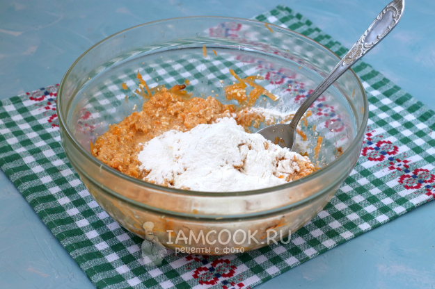 Добавить в полученную массу муку с разрыхлителем и перемешать тесто ложкой. Тесто должно быть густым и падать с ложки целым комком.