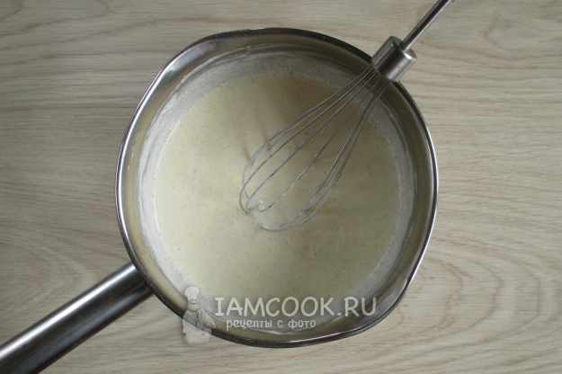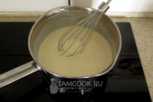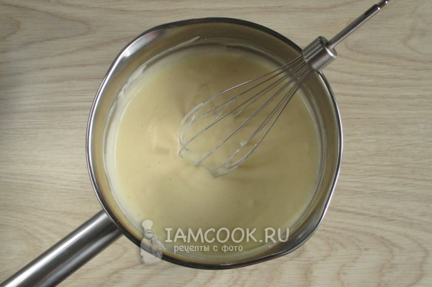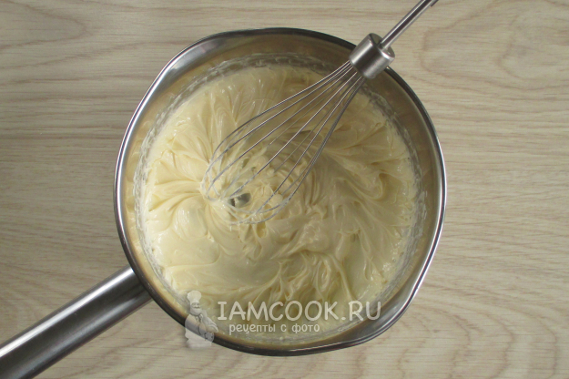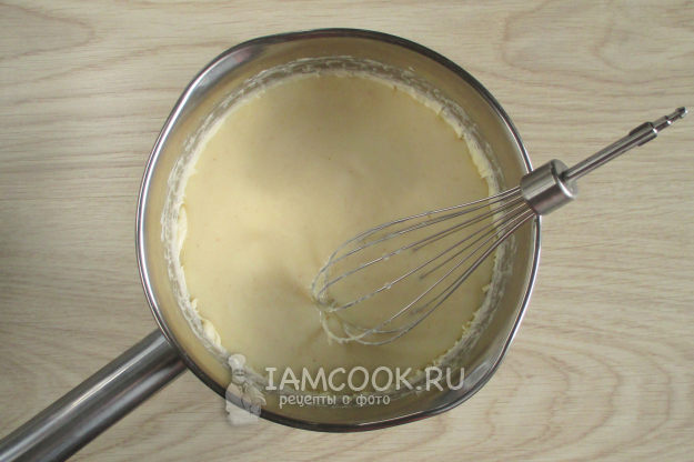 Постоянно помешивая венчиком, нагревайте массу до закипания на среднем огне (можно делать это и на водяной бане). При первых же признаках кипения снимайте массу с плиты.