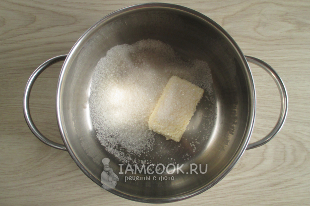 Для теста растопите сливочное масло на среднем огне, одновременно перемешивая его с сахарным песком.