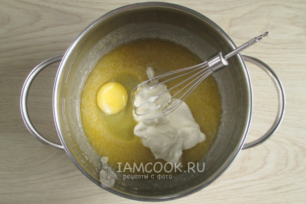 Дайте маслу остыть до теплого состояния, а затем добавьте яйцо и сметану. Перемешайте.