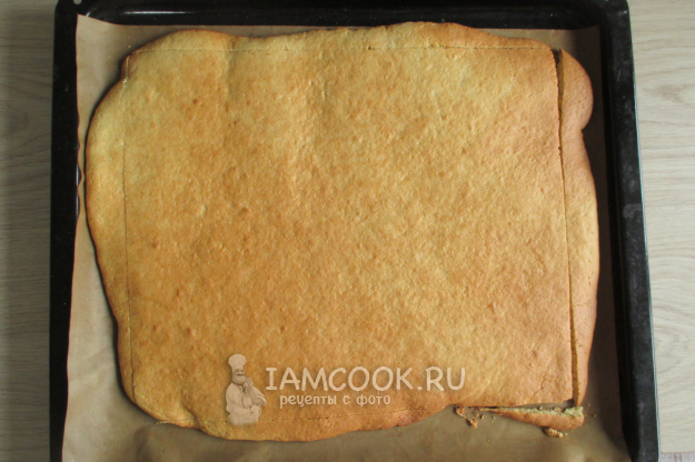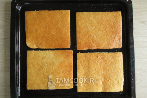 Разрежьте полученную основу на четыре равные прямоугольные части. На противень налейте пропитку и обмакните заготовки в неё сначала одной стороной, затем переверните и положите другой стороной.