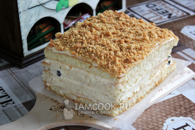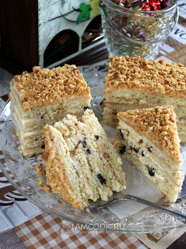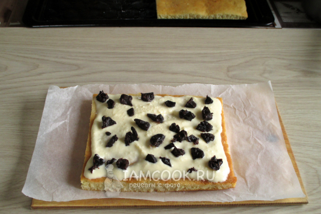 Соберите торт. Каждый корж промажьте сметанным кремом и добавьте чернослив, нарезанный небольшими кусочками.
