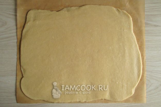 Охлажденное тесто раскатайте в тонкий пласт размером практически на весь противень. Удобнее запекать на противне, проложенном пекарской бумагой или ковриком для выпечки, на которых перед этим и раскатывать. Ориентировочно у вас получится заготовка 40х26-28 см.