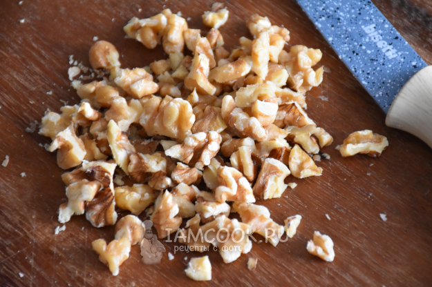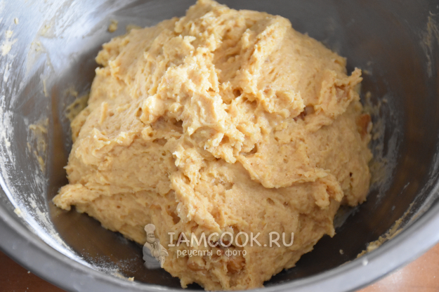 Добавить грецкие орехи, тыквенное пюре, яйцо и замесить тесто. Тесто должно быть мягким и липким, но держать форму. Поэтому если тесто получилось слишком липким - добавьте муки.