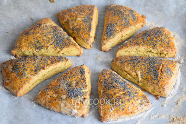 Переложить пергамент со сконами на противень и выпекать в разогретой до 190°С духовке 25 минут (до сухой шпажки). Остудить и посыпать по желанию сахарной пудрой.