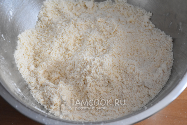 Холодное сливочное масло нарезать кубиками, добавить в мучную смесь и перетереть в крошку.