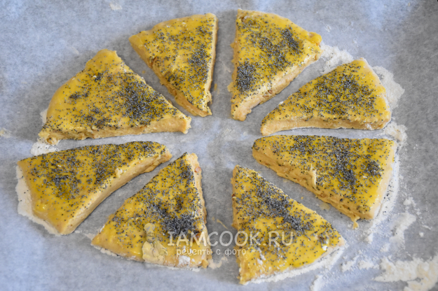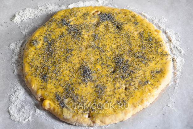 Желток взбить вилкой и смазать тесто, сверху посыпать маком.
