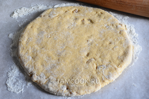 Пергамент припылить мукой, выложить на него тесто и раскатать в круг толщиной 2 см.