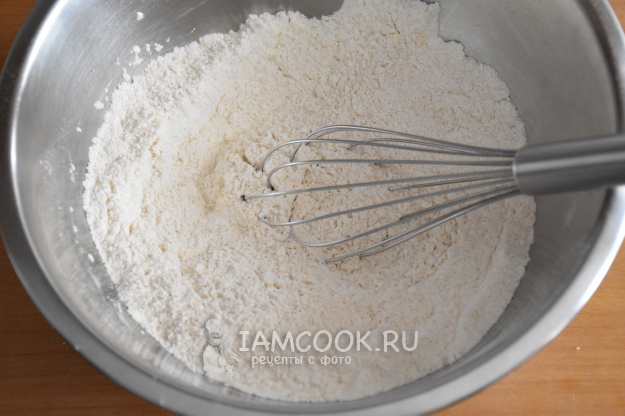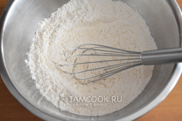В миску просеять муку, соду, разрыхлитель, корицу, мускатный орех, гвоздику, имбирь и перемешать венчиком до объединения ингредиентов.
