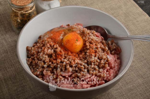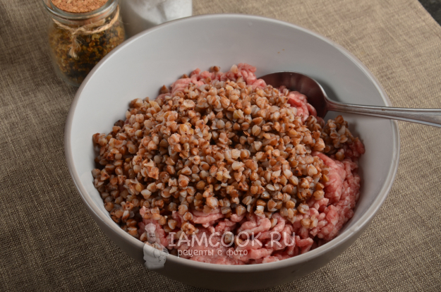 В глубокую миску или кастрюлю положите охлажденный (размороженный) фарш, добавьте к нему вареную гречку.