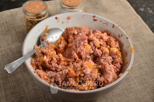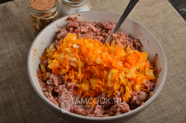 Обжаренные овощи переложите в миску с фаршем и гречкой.