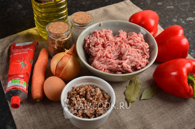 Возьмите все необходимые продукты для приготовления фаршированных перцев с гречкой и фаршем. Отмерьте нужное количество фарша, гречневой крупы. Помойте болгарский перец.