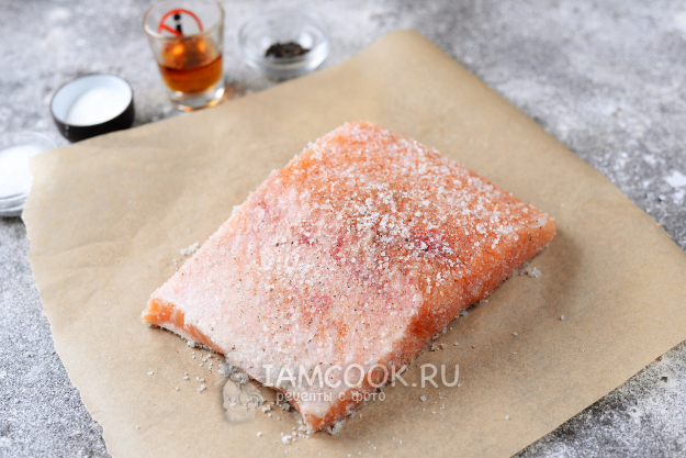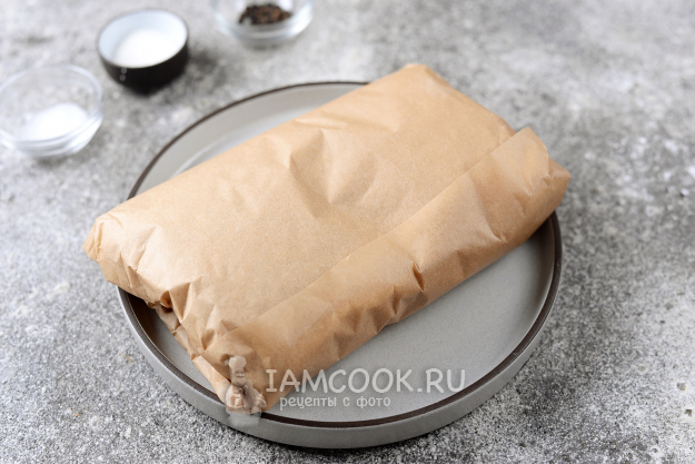 Плотно заверните в пергамент, тщательно подвернув края. Отправьте рыбу на 1-2 суток солиться. Время от времени переворачивайте заготовку, чтобы филе солилось равномерно.