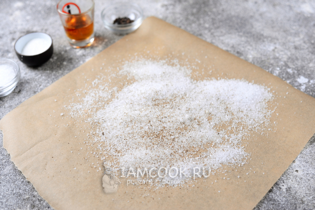 Оторвите большой кусок пергамента, посыпьте его смесью соли и сахара, добавьте растертый в ступке или мельничке черный перец.