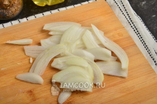 Репчатый лук очистите от шелухи, помойте и нарежьте тонкой соломкой.