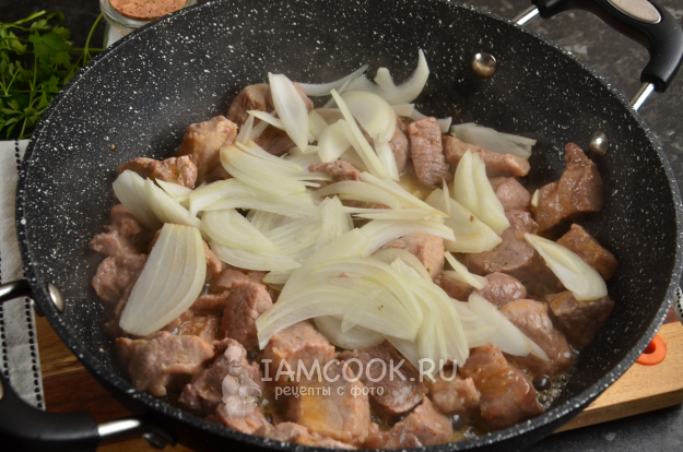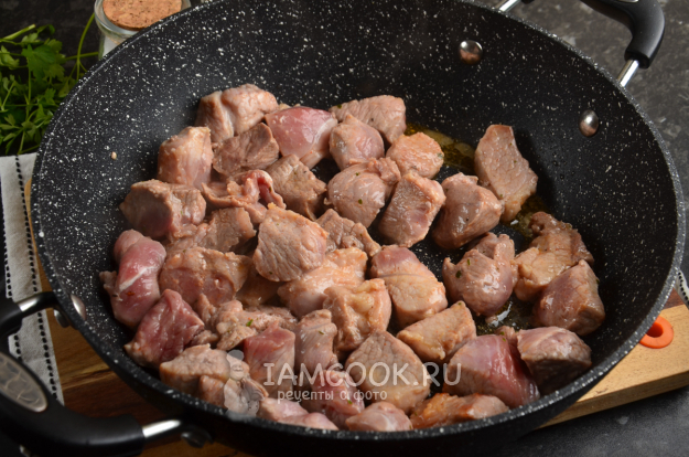 На растительном масле обжаривайте в течение 10 минут кусочки свинины. Сделайте средний огонь и помешивайте мясо.