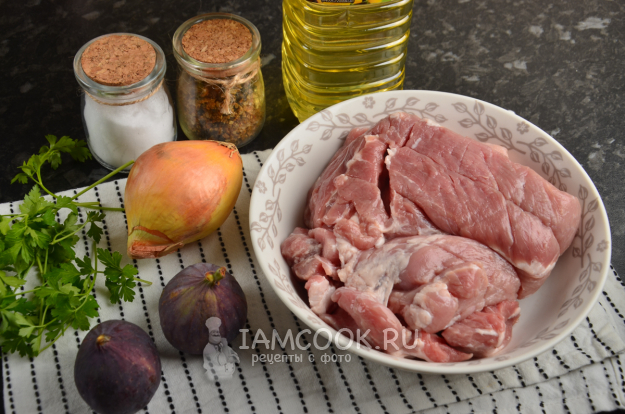 Подготовим все нужные продукты для обжарки и тушения свинины с инжиром. Если свинина была заморожена - лучше дать оттаять ей при комнатной температуре.