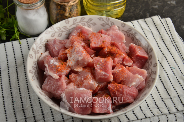 Подсолите мясо и добавьте специи. Если есть время для маринования, то можно влить в миску растительное масло, перемешать и оставить в прохладном месте на час-два. Если времени на маринование нет, можно переходить к следующему шагу.