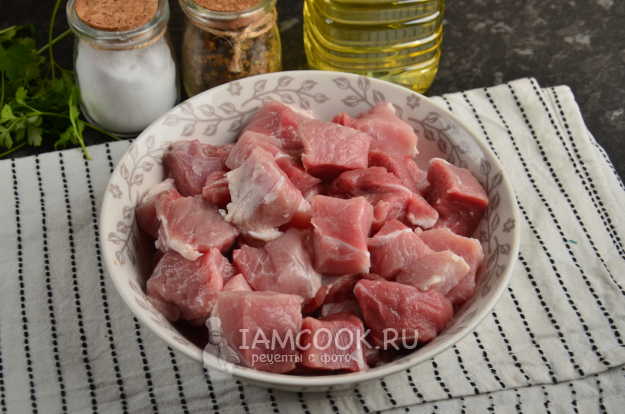 Свинину нарежьте небольшими квадратиками или полосками. Излишки жира можно обрезать.