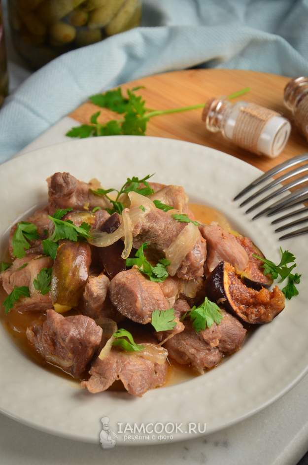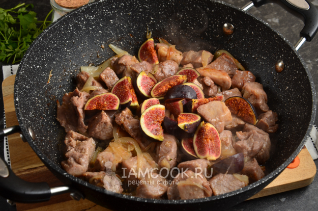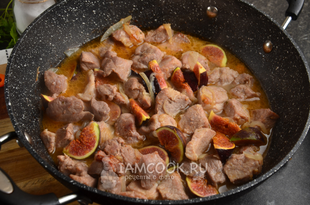 Влейте в сковороду около 200 мл воды и тушите мясо с инжиром под крышкой 10 минут.
