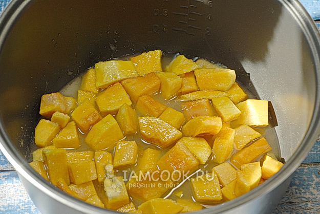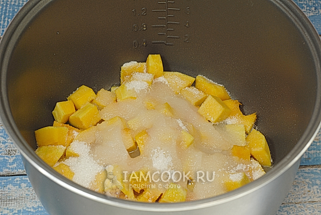 Кусочки тыквы сложим в чашу мультиварки, засыпем сахаром и оставим на час-два.