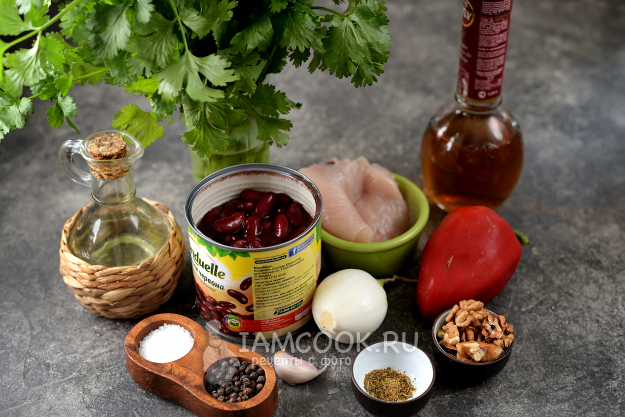 Подготовьте необходимые продукты для салата «Тбилиси» с красной фасолью и куриной грудкой. Курицу и овощи с травой помойте и обсушите.