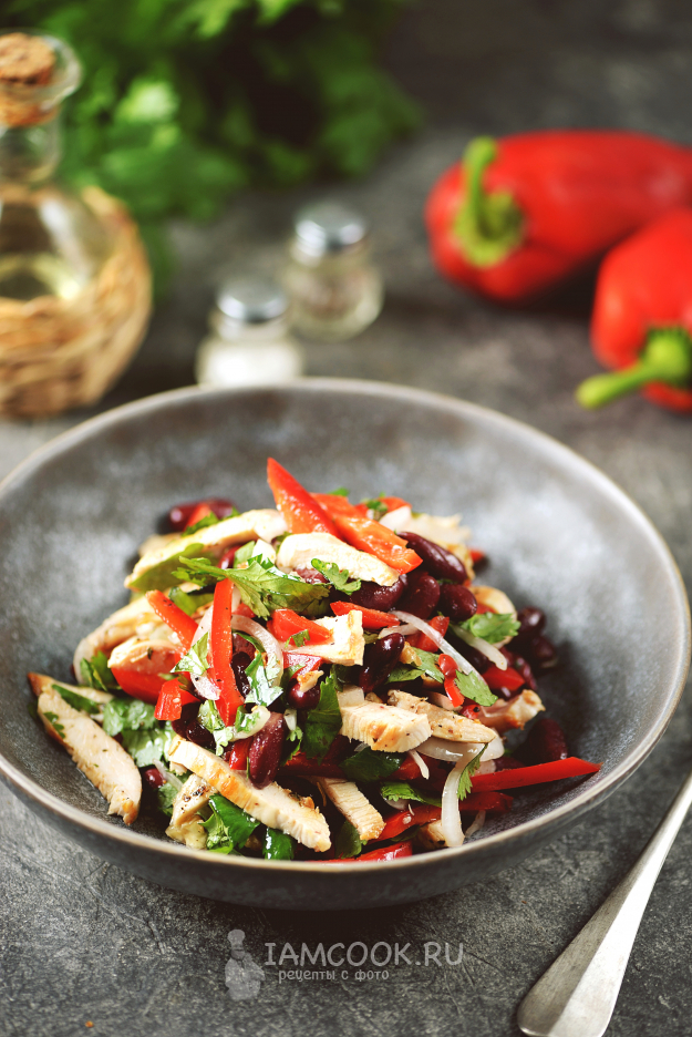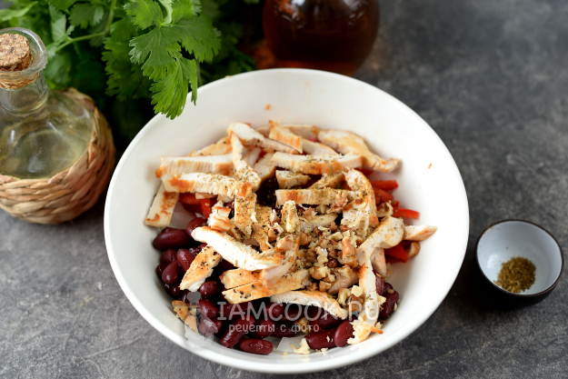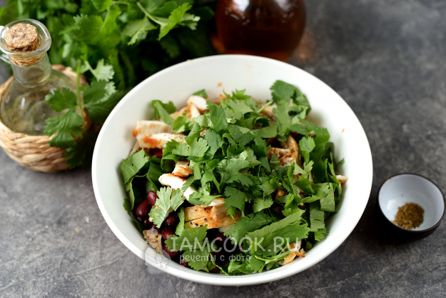 Салат «Тбилиси» с красной фасолью и куриной грудкой готов. Это сочетание продуктов очень удачное и салат точно понравится вашим домашним.