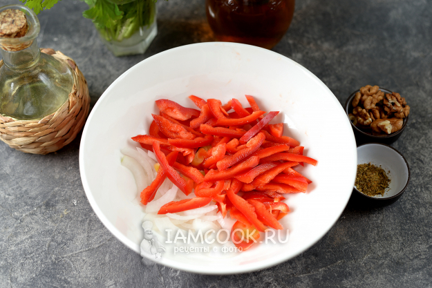 Пока филе готовится на сковороде, тонкой соломкой нарежьте сладкий салатный лук и очищенный от семечек и плодоножки болгарский перец. Лук для салата я всегда использую сорта стерлинг, он сочный и сладкий, его не нужно мариновать в уксусе.