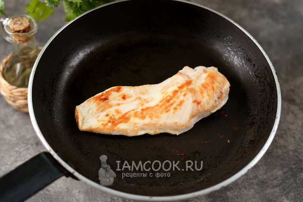 Тонкий кусок куриного филе посолите и поперчите, чуть смажьте разогретую сковороду растительным маслом, обжарьте филе минуты по 3 с каждой стороны - до слегка золотистой корочки.
