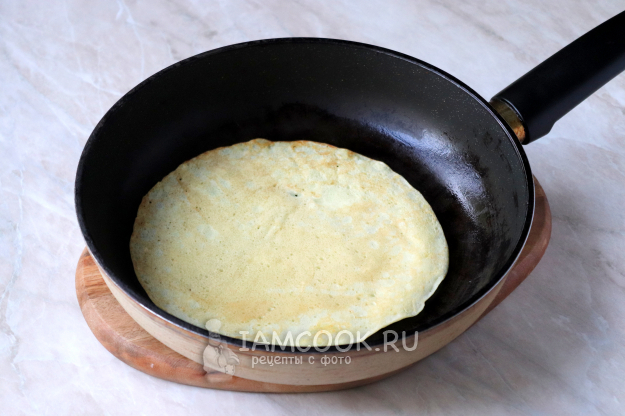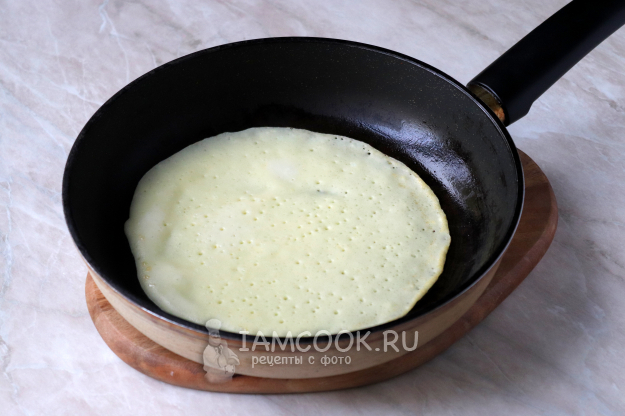 Налейте порцию теста на разогретую сковороду, предварительно смазанную тонким слоем растительного масла, и распределите его по всему дну, сформировав круглую заготовку. Если сковорода была хорошо прогретой, на поверхности блина сразу же начнут лопаться пузырьки воздуха, образуя дырчатую структуру.