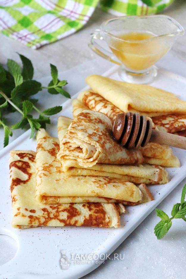 Блины на кислом (прокисшем) кефире получаются очень вкусными. На стол подавайте их тёплыми с мёдом, сметаной или сгущённым молоком.