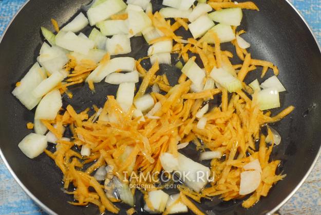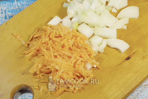 А пока вода закипает, подготовим остальные ингредиенты: нарежем лук мелко, натрем морковь.