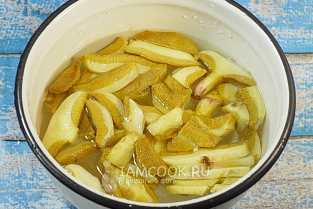 Хорошо промоем грибы в нескольких водах. Сложим в кастрюлю, наполним кастрюлю водой. Поставим на огонь, доведем до кипения, соберем пену.