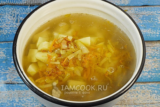 Вливаем в суп. Провариваем еще 5-7 минут. Пробуем суп на соль: если есть необходимость, добавляем еще соль. Перчим по вкусу.