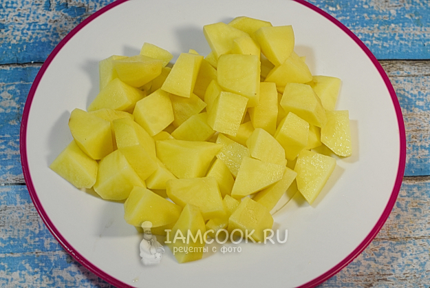 Картофель нарежем средними кусочками, можно нарезать крупнее, можно мельче — как вы любите.