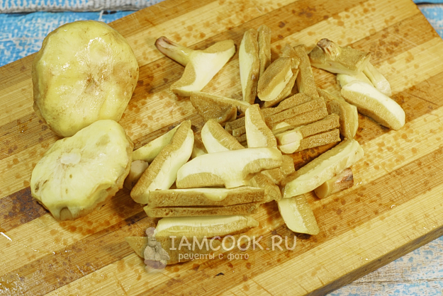 Обработаем маслята. С грибов нужно снять кожицу на шляпке (чистятся грибы легко). Червивые части грибов удалим. Нарежем небольшими дольками.