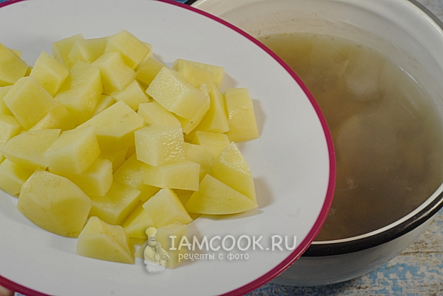Добавим картофель к закипевшим грибам после того, как сняли пену. Солим. Варим 25 минут.