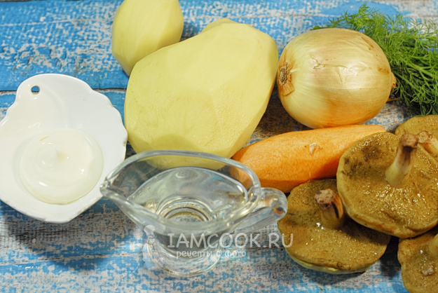 Подготовим продукты для грибного супа из маслят. Картошку, морковь и лук почистим и вымоем.