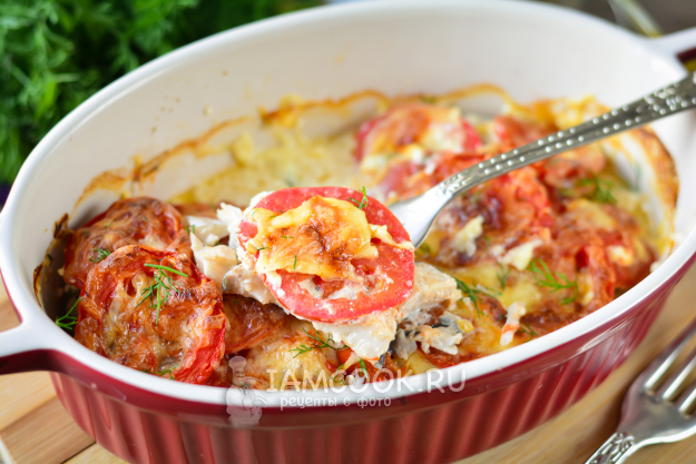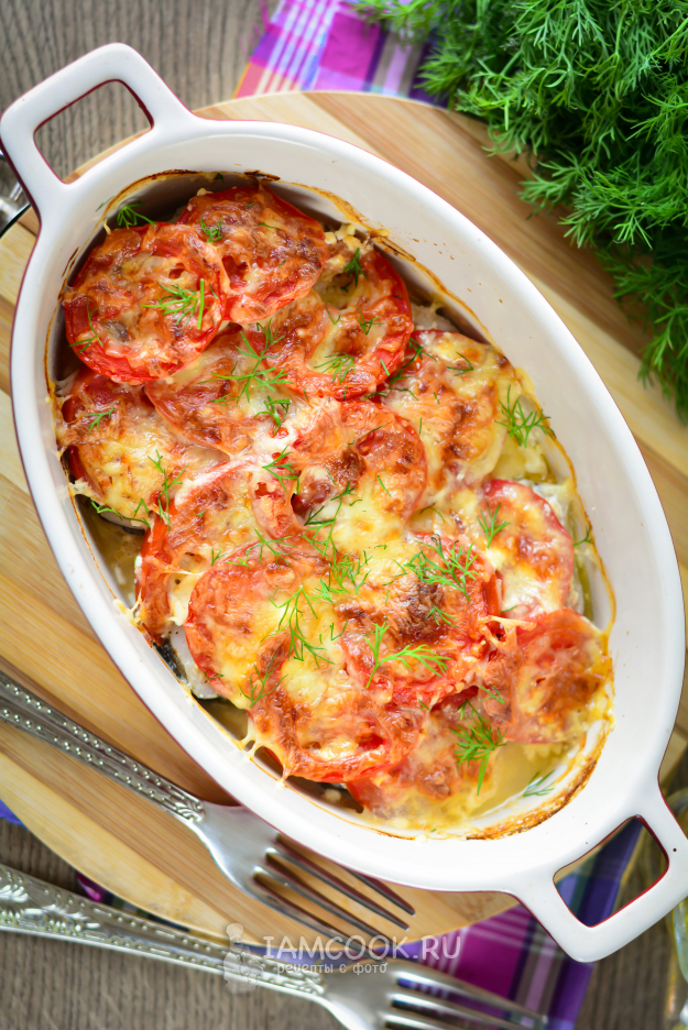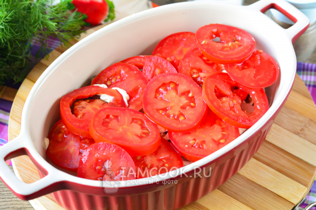 На рыбу выложите кружочки помидоров. Овощи слегка посолите.