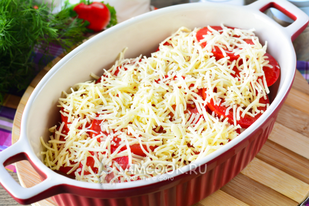 Блюдо присыпьте тертым сыром и отправьте запекаться в духовку.