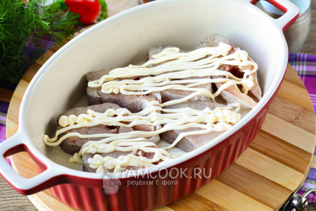 Рыбу полейте тонким слоем майонеза. Майонез используйте любой - или магазинного производства, или домашнего.